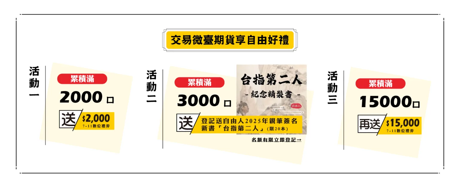 - 交易滿3,000口,登記送自由人簽名新書,限量20本(先達標三千口先獲得喔!)