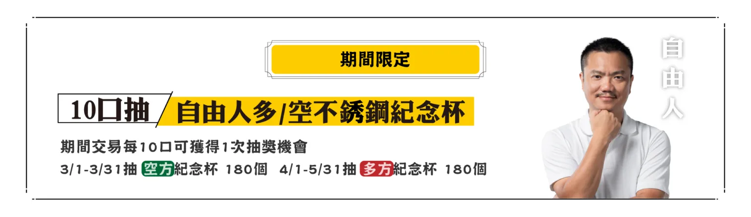 - 3月內交易10口微臺即獲得1次抽獎機會,抽「空方不銹鋼紀念杯」一個,共抽出180個。