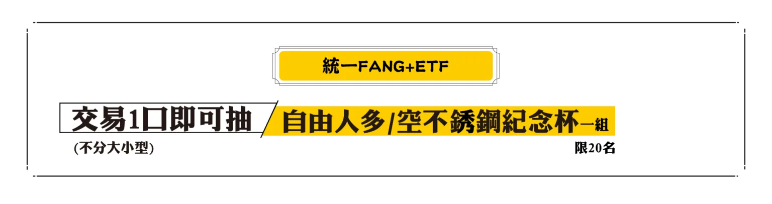 活動期間內,交易「統一FANG+ETF期貨」(不分大小型) 1口即獲得1次抽獎機會,抽「多空不銹鋼紀念對杯」一組,共抽出20名。【統一期貨新開戶限定活動】完成活動內容,即可獲得相應獎項。