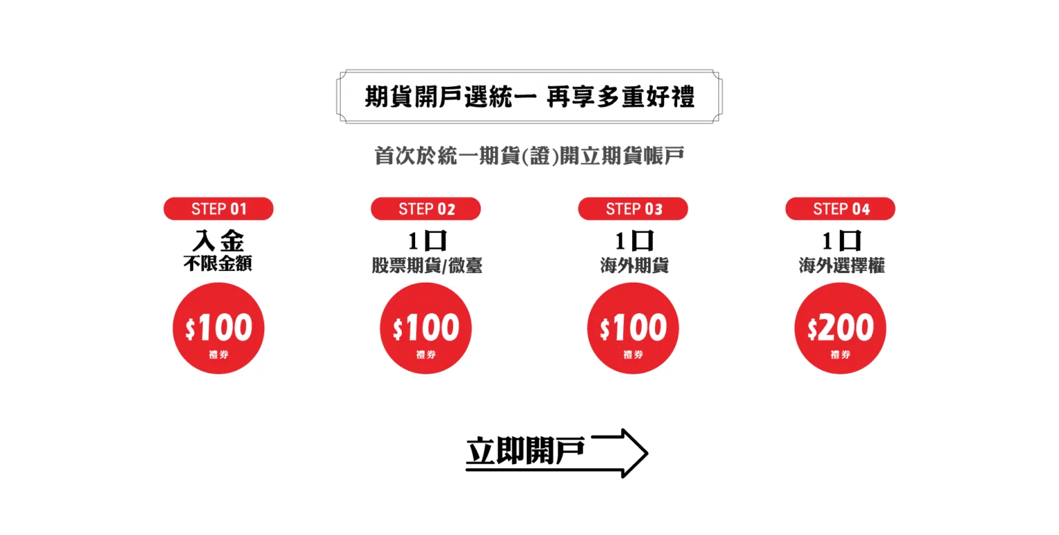 【統一期貨新開戶限定活動】完成活動內容,即可獲得相應獎項。