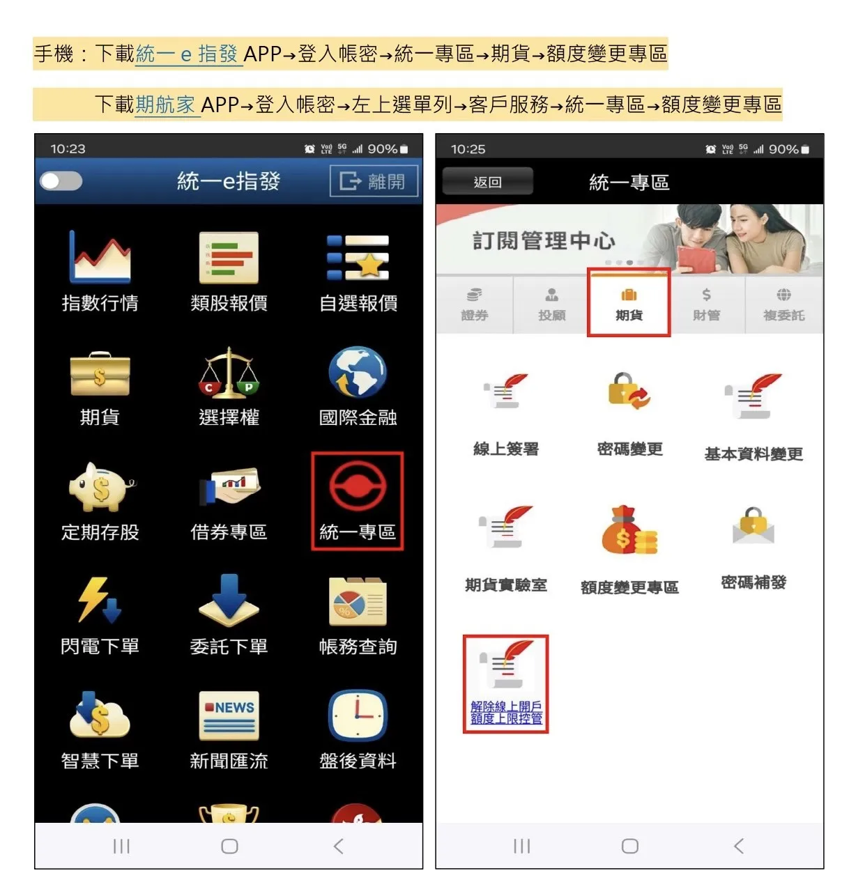 原本線上開戶的期貨帳號透過電腦或手機操作,申請解除最高在倉原始保證金100萬的交易額度限制。怎麼申請呢?電腦版或手機APP都可以申請,流程如下: