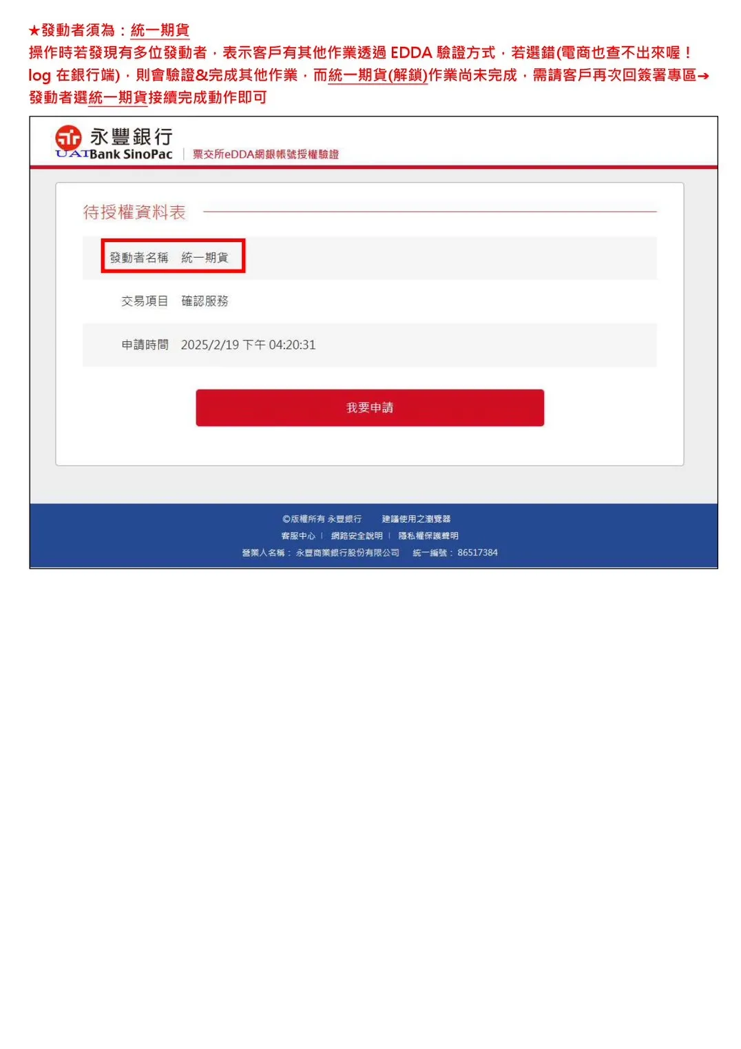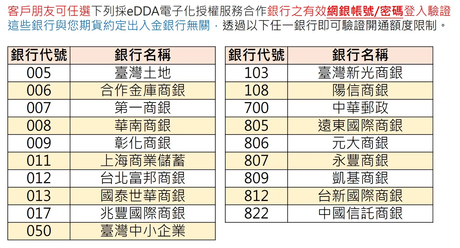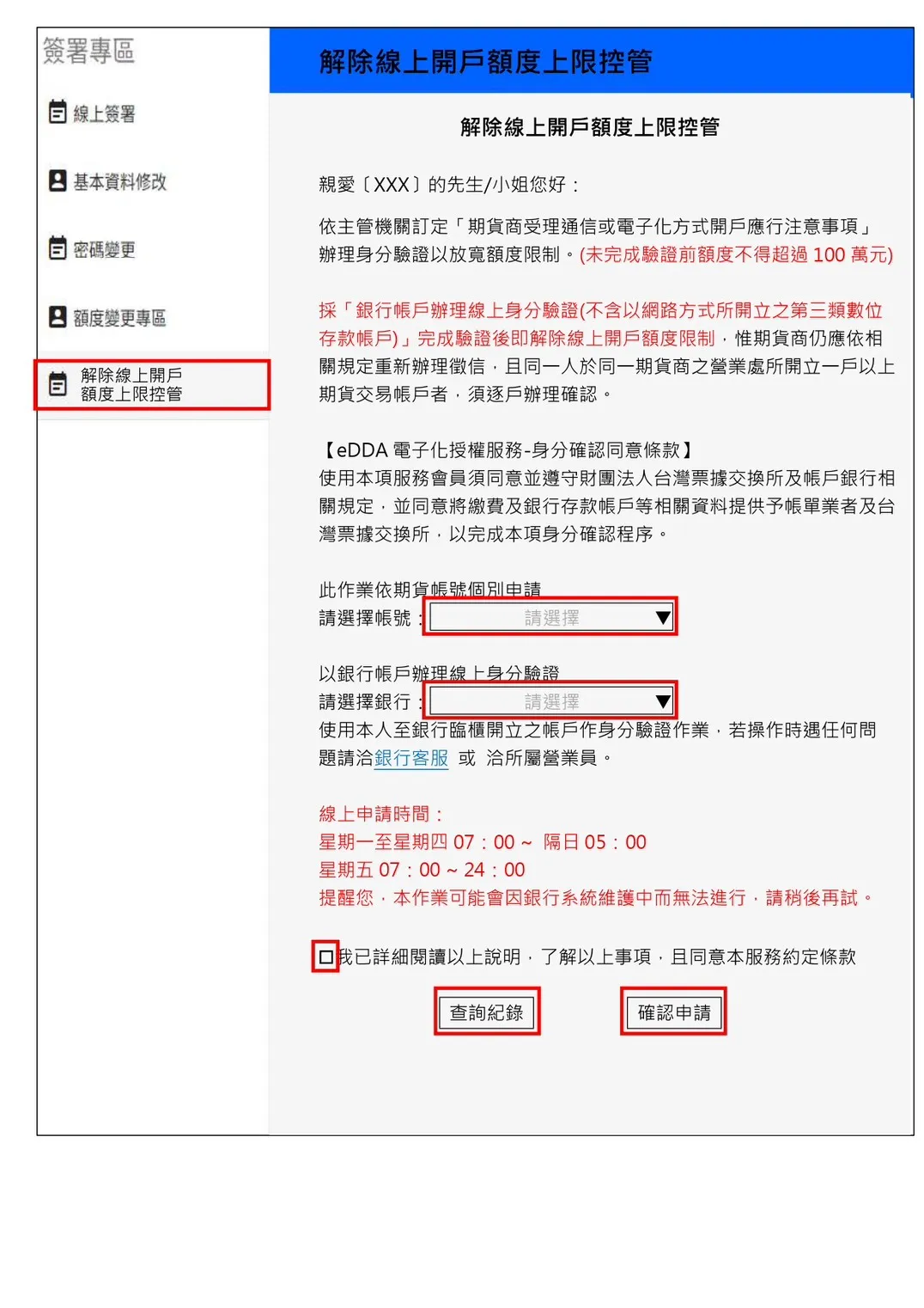 若您的期貨帳戶是線上開戶者,想開通交易額度無限額調高的功能,不必再臨櫃或安排外開再開第二戶囉!採eDDA電子化授權服務,透過銀行帳戶辦理線上身分驗證【解除線上開戶額度上限控管】,就可以不再受交易額度100萬限制啦!