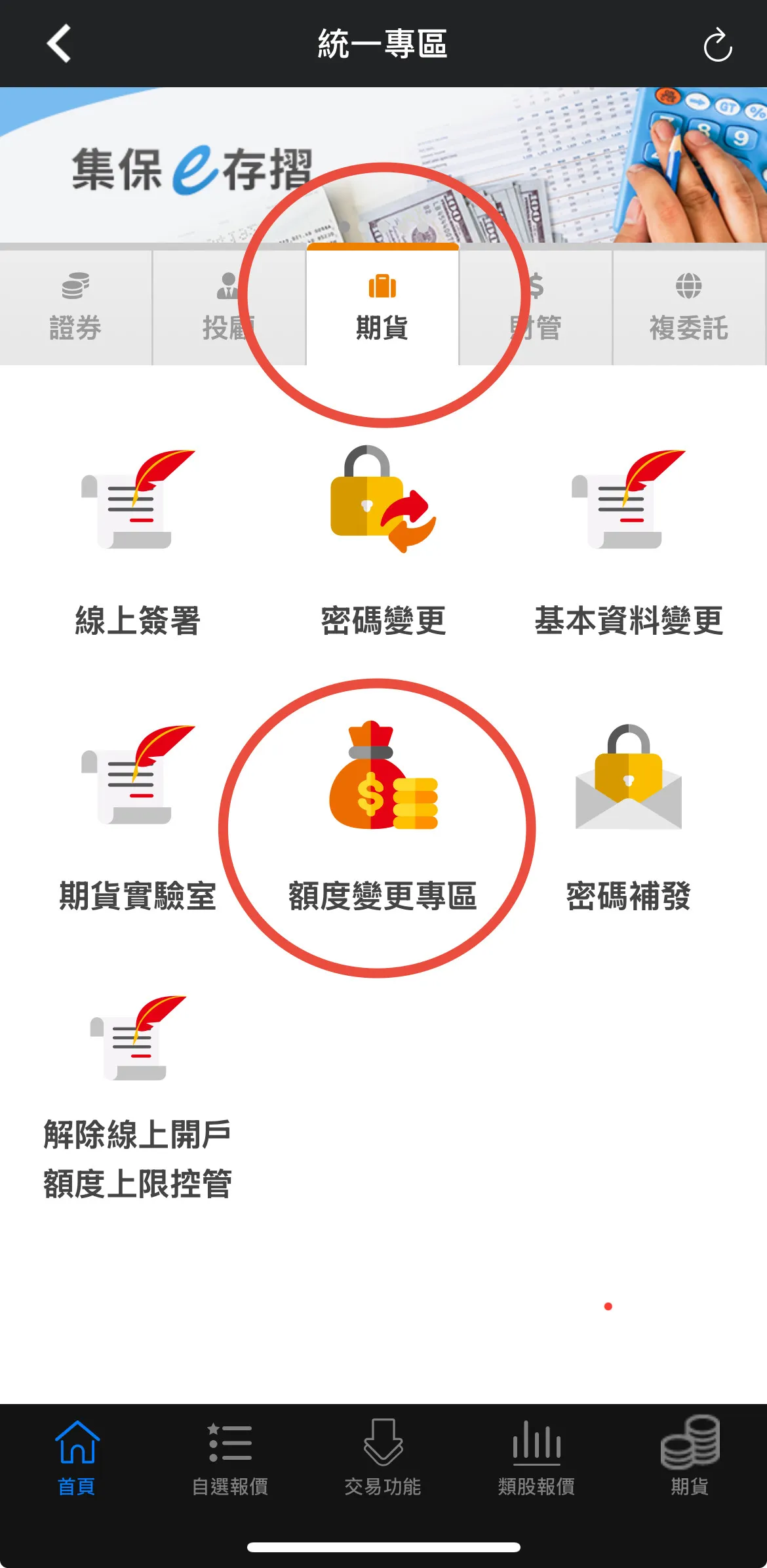 請使用統一e指發、期航家手機APP進入,根據以下為操作步驟調高額度:(交易額度為一年一次審查,變更額度後若一年期限到了,靖婷儷雯會提前通知您,請依步驟也進行變更)