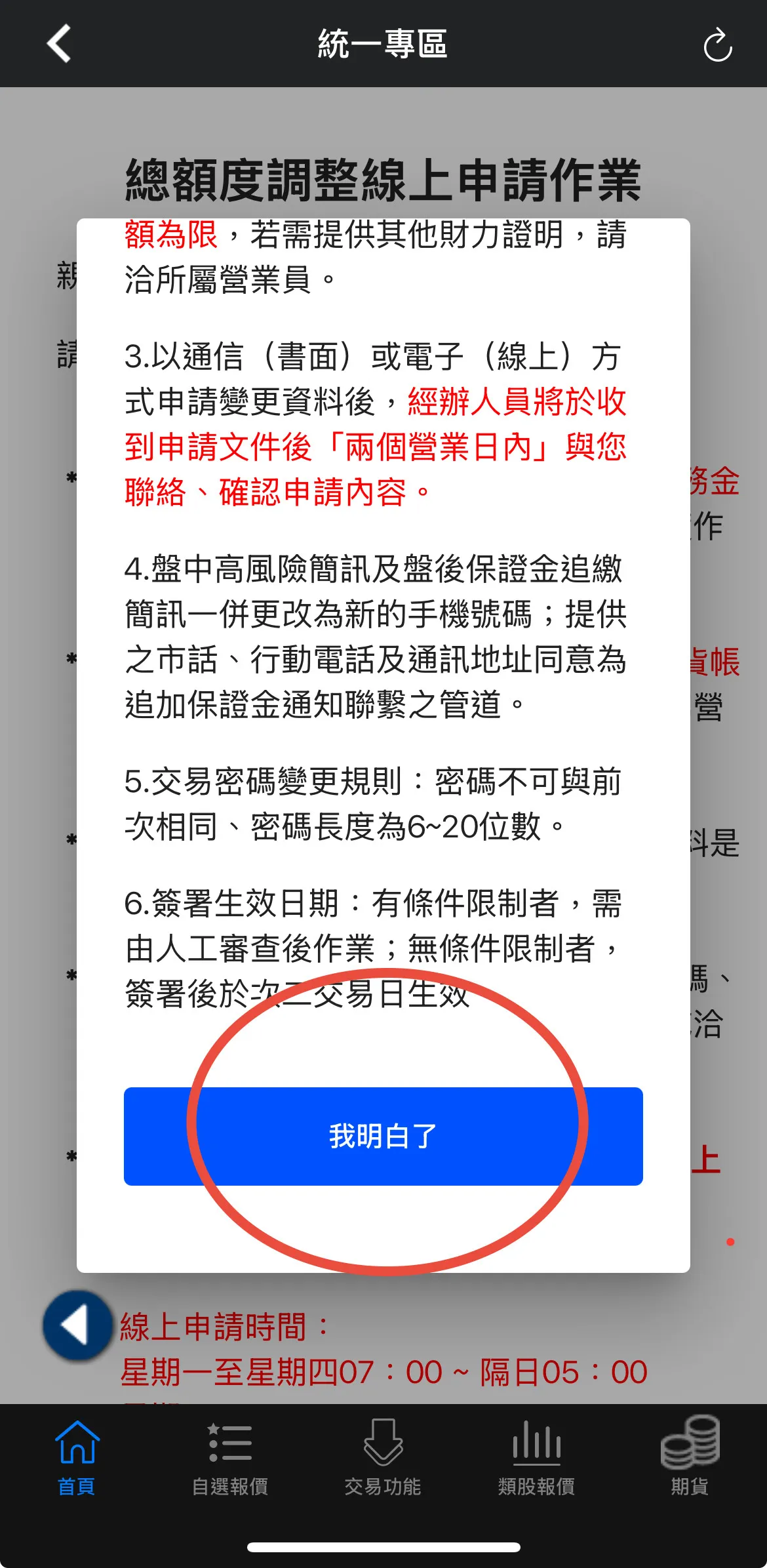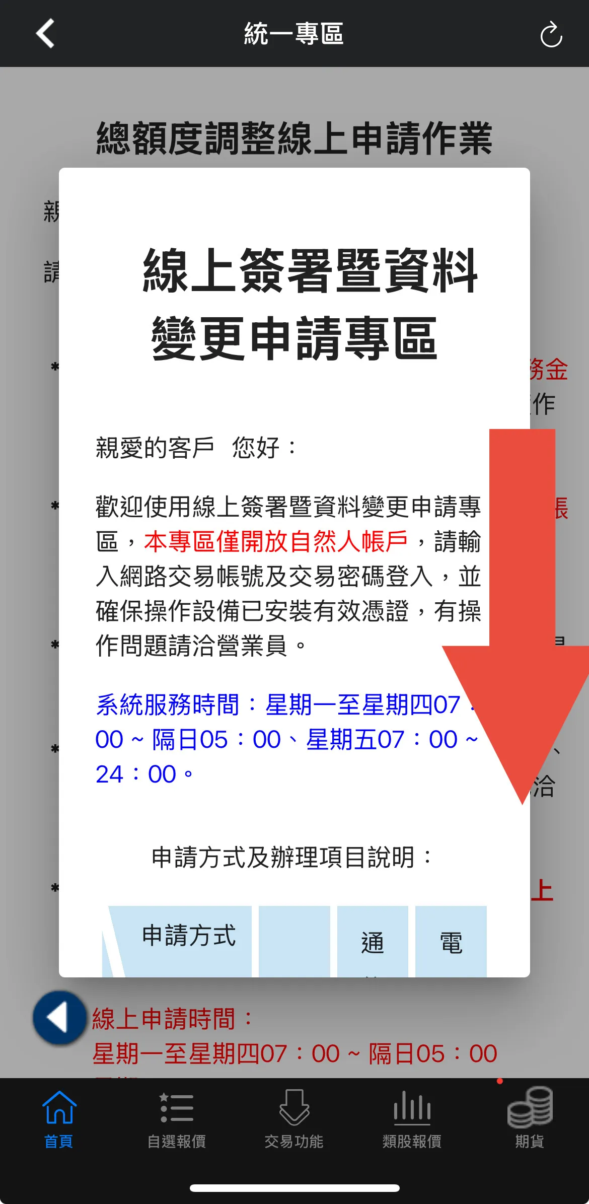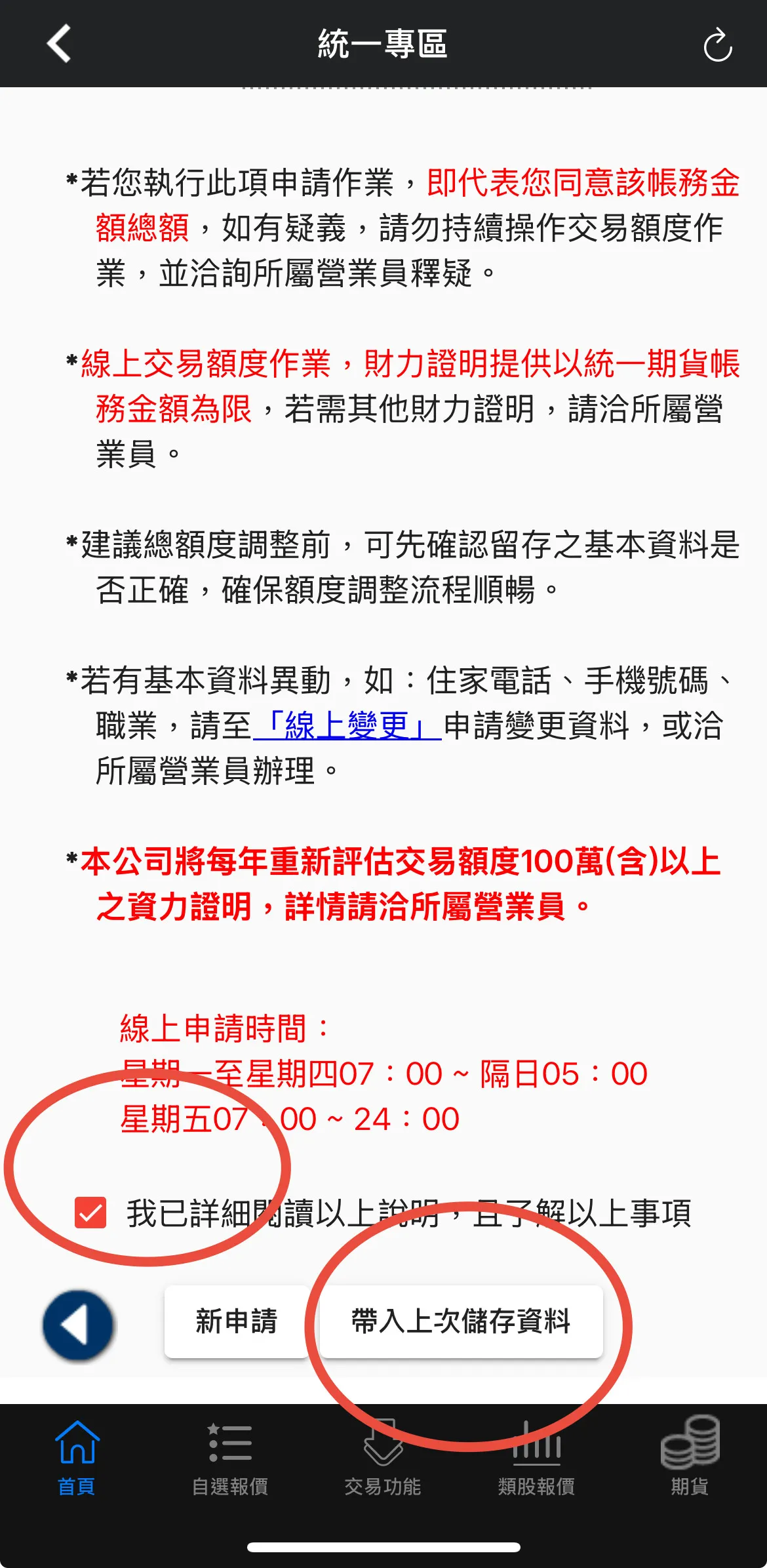 ★填寫上特別注意:周一~周五交易日可填寫,因填寫後需經人工審核,請務必於一般盤(日盤)交易時間內完成線上變更,填寫後若能提醒靖婷&儷雯,我們收到後會儘快送件以利交易額度儘快調高;若是晚上才填寫交易額度變更,需等待次一營業日上午才能進行審核送件。