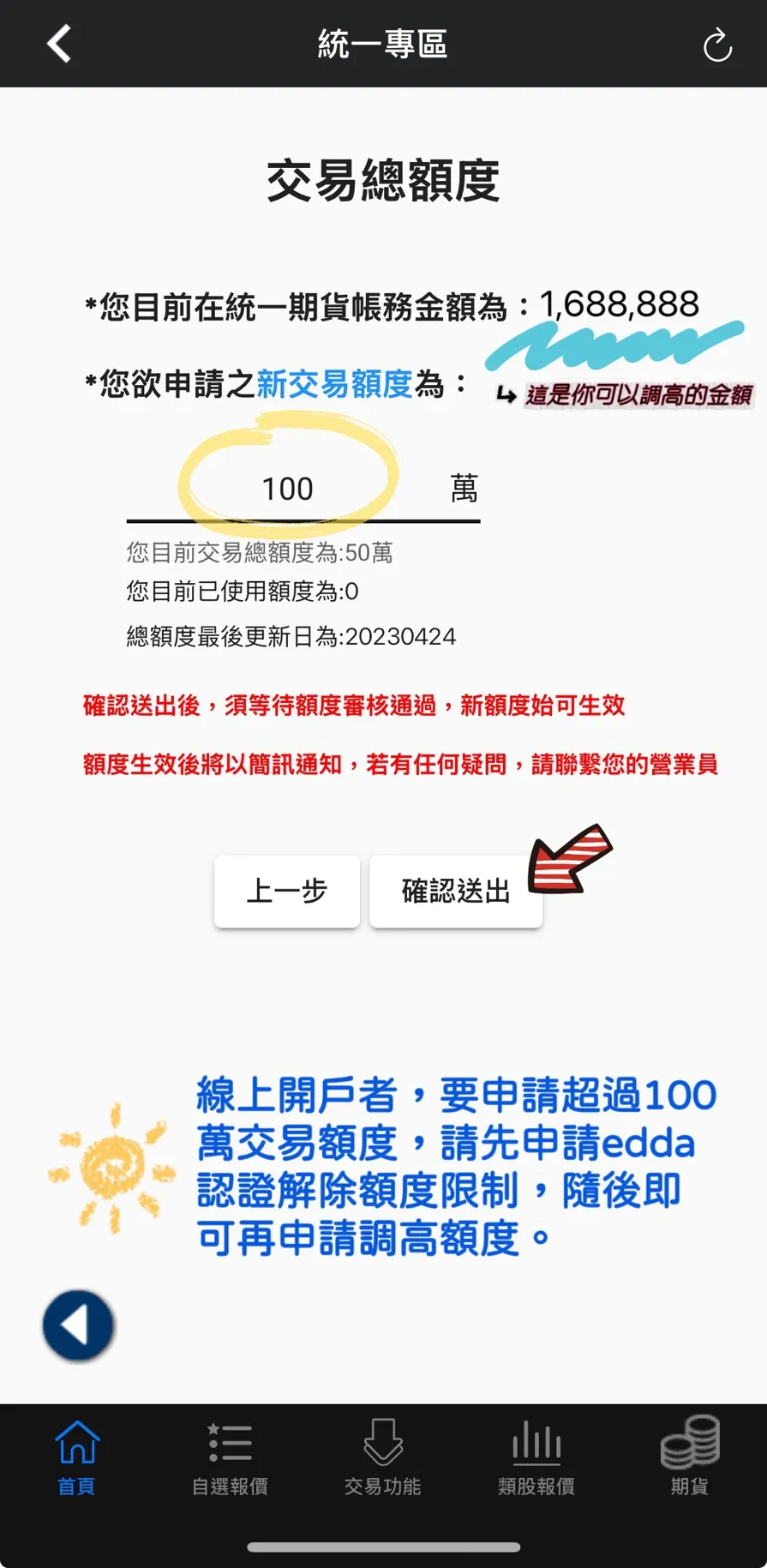 - 交易額度申請以萬為單位,如果要申請100萬,請輸入100即可。送出申請後,收到簡訊就代表額度已開通。