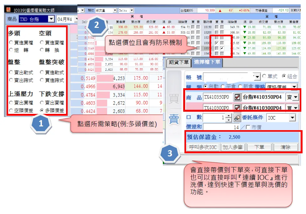 功能特色:選擇權從初學到進階,從單式到各種組合部位,引導交易人在不同情境下正確選擇對應之組合策略(貼心設計防呆機制,不怕選錯履約價),並結合帶價下單與多次IOC功能。