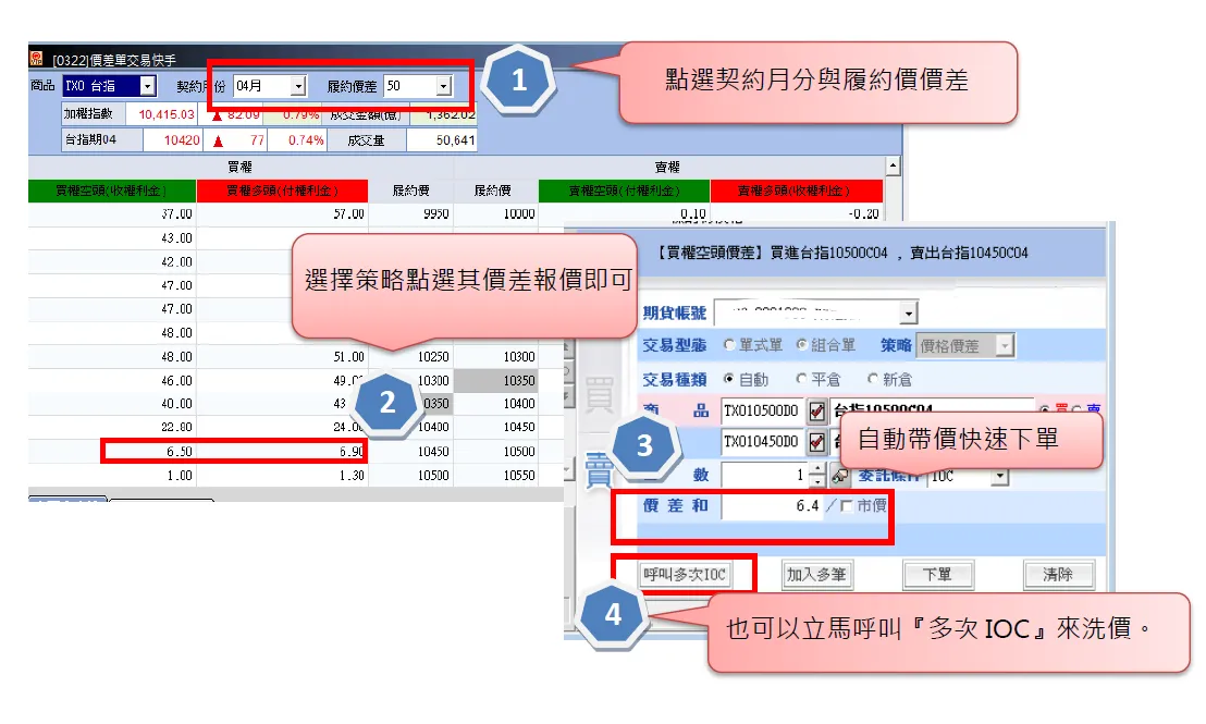 功能特色:首創四種垂直價差(買權空頭價差買權多頭價差賣權空頭價差賣權多頭價差)直接以價差點數T字報價,不必靠心算,不怕算錯,價差值一目了然,直接點價下單,並可連動多次IOC功能。