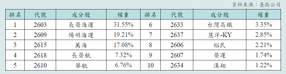 航運指數個股權重排名輪動頻繁,每年權重互有增減,無特定個股權重長期排名第1或第2情形。