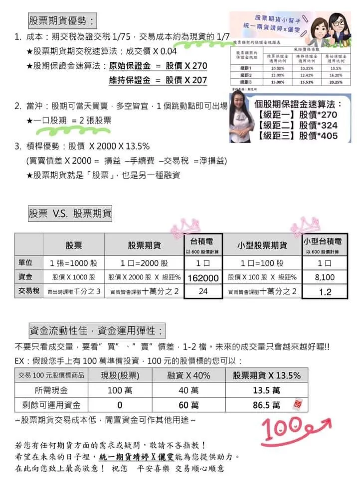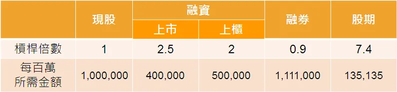 大多數的股票期貨契約規格是一口等於兩張現貨,也就是一口等於2,000股,故股票期貨漲跌1元,損益金額就等同於2,000元。同時股票期貨只需要13.5%契約金額的保證金,故槓桿高達7.4倍。部分股票期貨如果有異常波動,或是期交所認為有必要時,也會適度的調高保證金比例,但總的來說,股票期貨具有比現貨的融資買進更高的槓桿,也就具有更靈活的資金運用優勢。