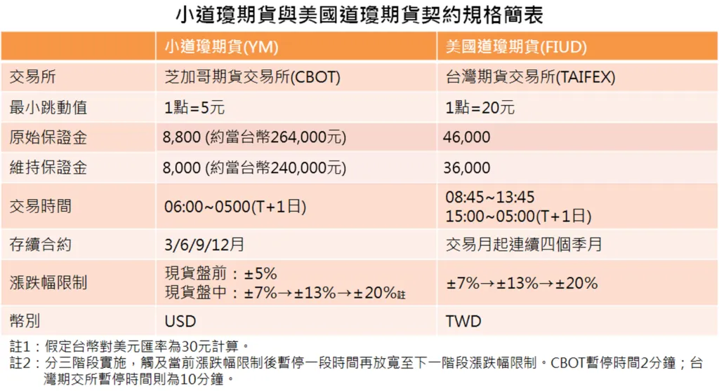 ●契約規格:CBOT交易所小型道瓊指數期貨(YM)原始保證金目前為8,800美元,折合台幣約26.4萬元,跳動點上是以1點為1跳,每跳價值5美元。