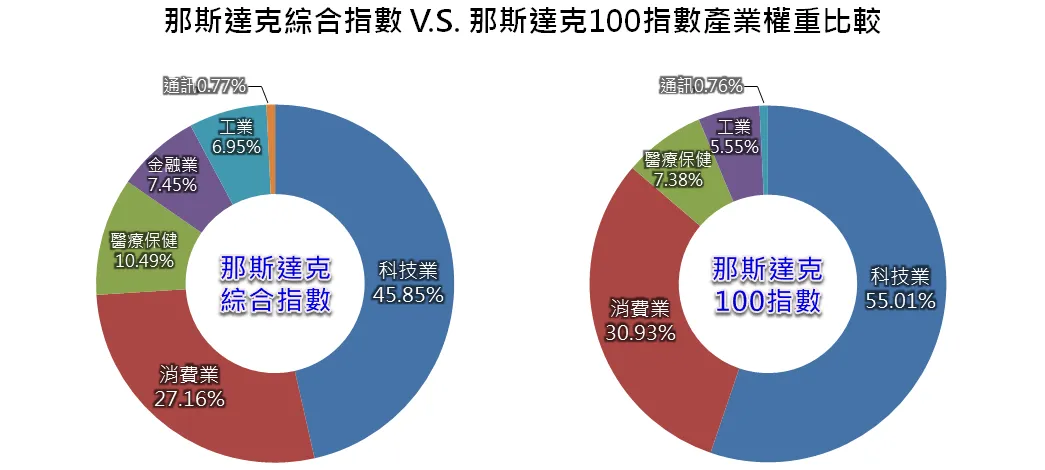 在產業權重上,那斯達克100指數明顯更偏重於科技業,占比達55.01%,相較於那斯達克綜合指數來說高了將近10%;消費業也有超過30%權重,科技業及消費業合計那斯達克100指數權重超過85%占了決定性的地位。另外那斯達克100指數排除了金融業,在產業一致性更高的同時,也增加了指數的波動度,簡單來說,那斯達克100會「更活潑」些,當然也有更多的交易機會囉!